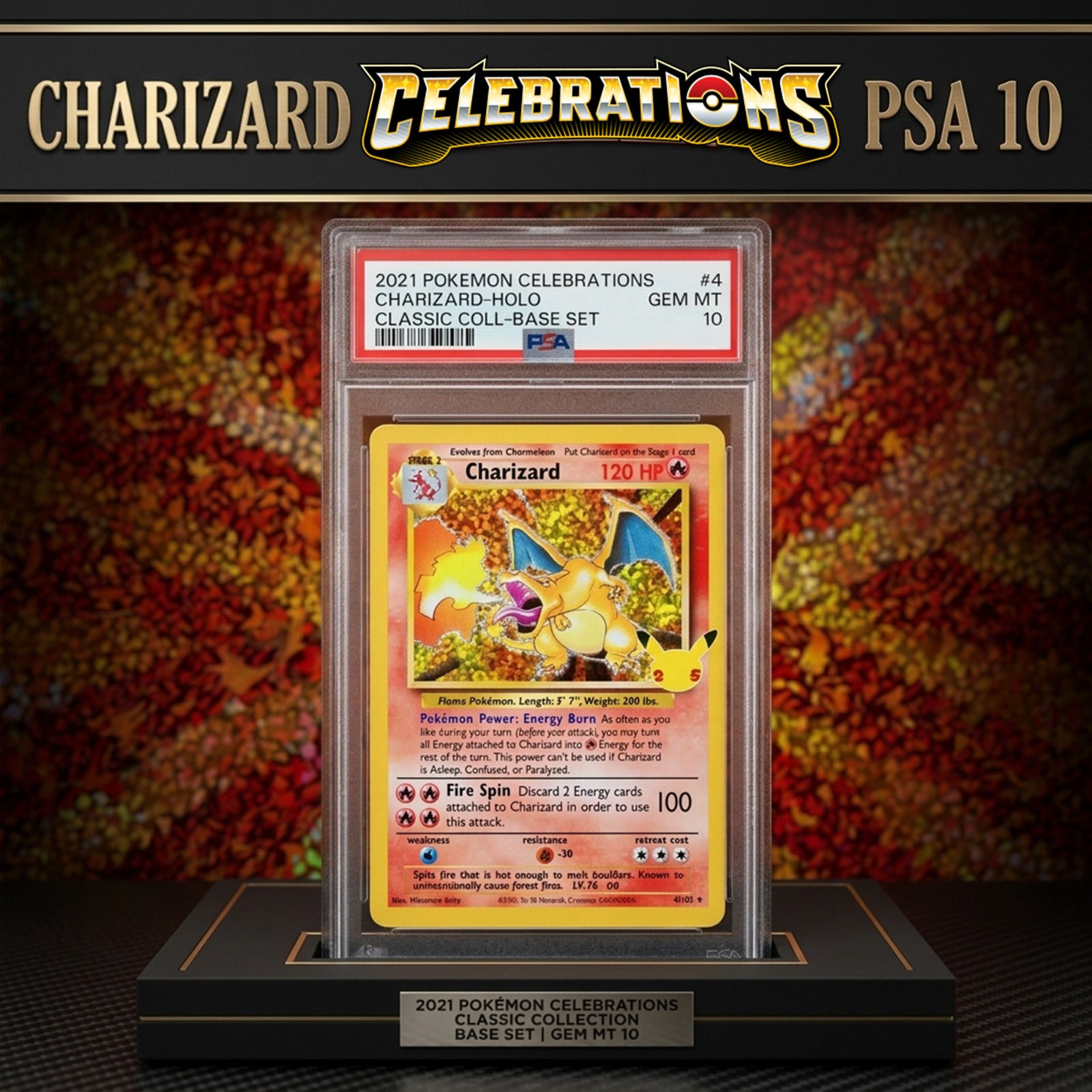 Don’t miss your chance to own one of the most iconic Pokémon cards ever released — the Charizard Celebrations, professionally graded a perfect PSA 10 for flawless condition and elite collector status.